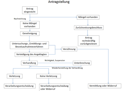 Das Verwaltungsverfahren bei Patentverletzungsstreitigkeiten ist dem von Rechtsstreitigkeiten ähnlich. Im Allgemeinen gibt es Verfahren für den Antragsteller, um einen Antrag auf Verarbeitung, Antwort des Antwortenden, mündliche Anhörung und Entscheidungsfindung zu stellen. Das allgemeine Flussdiagramm ist wie folgt.
