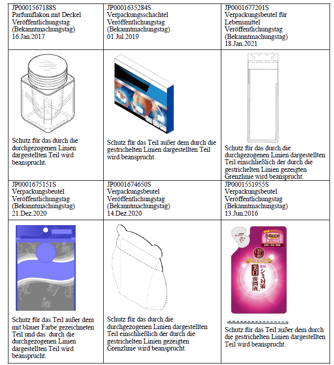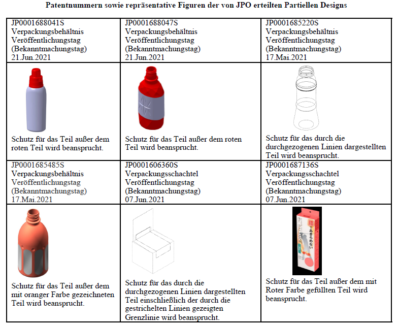 Der obigen Tabelle ist es erkennbar, dass das Partielle Design mittels der gestrichelten Linien in Kombination mit den durchgezogenen Linien dargestellt wird, oder der nicht beanspruchende Teil durch einfarbige halbtransparente Schicht abgedeckt wird, oder beim Partiellen Design die gestrichelten Linien zur Darstellung der Grenze zwischen dem beanspruchenden Teil und dem Rest verwendet wird.