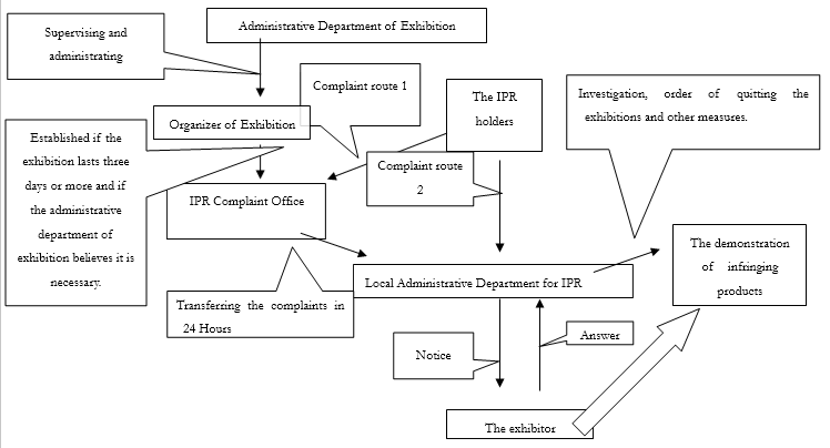 According to Measures for IPR Protection in Exhibitions, if the exhibition lasts three days or more and if the administrative department of the exhibition believes it is necessary, the exhibition host shall establish an IPR complaint office during the exhibition. The complaint office usually is comprised of members from the host, the administrative department of the exhibition, the administrative authorities for patent, trademark, and copyright and so on. If the exhibition does not set up a complaint office, the local IPR administrative department may receive the IPR cases that arose at the exhibition.