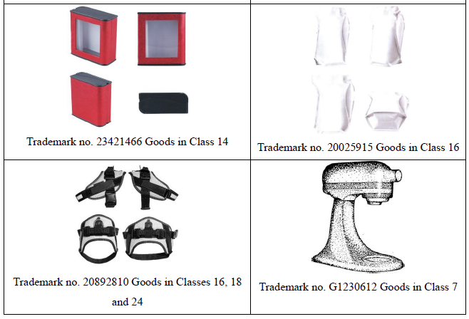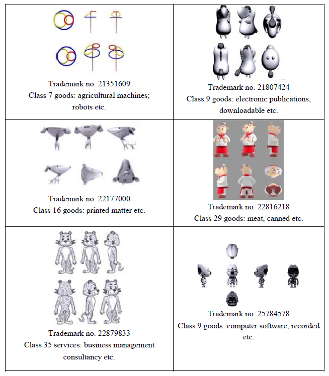 This mark has been granted registration on the goods “leather bags; school bags” in class 18 and “clothing” in class 25, but has been objected on the goods “toys” in class 28 due to lack of distinctiveness. The reasoning is that this three-dimensional mark used on the toys is much more like toys themselves than a mark for the product.