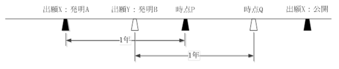 【例】発明Aに係る出願Xと、発明Bに係る出願Yは、同一出願人により異なった日に出願された2件の出願である(米国又は日本の出願人が米国特許商標庁又は日本特許庁に出願したものであり、いずれも最初の出願である)。内容からすれば、出願Xは出願Yに対して抵触出願の要件を満足する。仮に、出願Xの公開日が出願Yの出願日から1年後であるとする。