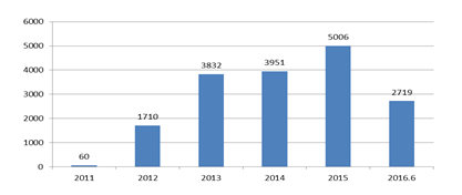 図1 は、SIPO が2011年11月から2016年6月末までに受理した各年のPPH申請件数を示している。