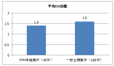 図4によれば、PPH申請案件の平均OA回数は1.4回で、一般出願案件の平均OA回数1.6回より、0.2回/件少なくなっている。このことからも、PPH申請がOA回数の減少によって、費用の低減にある程度の効果を有していることが分かる。