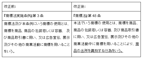 改正前は、商標・標識が商標法における商品の出所を識別する役割を果たすか否かを問わず、商品又は役務と結び付きさえすれば、商標の使用となるという理解しやすい文言であった。しかも、両者を結び付ける方式も、流通分野だけに限定されていなかった。