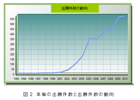 統計によると、中国特許データベースにおけるMIMOに係る2012年9月5日までの特許出願件数は、計3332件である。図2は、年毎の出願件数と出願件数の動向を示している。なお、特許出願は原則として18ヶ月の公開準備期間を有するので、現(2012年9月の)時点では2011年3月までの特許出願が公開されている。そのため、図2に示すデータは2010年までのものであり、2011年及び2012年のデータはない。