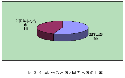 図3は、総出願件数における外国からの出願と国内出願のそれぞれの比率を示している。外国からの出願は1470件で、44%を占めているのに対し、国内出願は1862件で、56%を占めている。国内出願総件数は外国からの出願総件数に比べて12%多いが、国内出願人には、外国企業の中国子会社が含まれており、その特許は実質的に外国企業によってコントロールされている。例えば、アルカテル・ルーセント上海ベル(以下、上海ベルという)、北京SAMSUNG通信技術研究有限公司(以下、北京サムソンという)などが挙げられる。したがって、定性的観点からみれば、件数において、外国からの出願と国内出願はほぼ同じといえる。