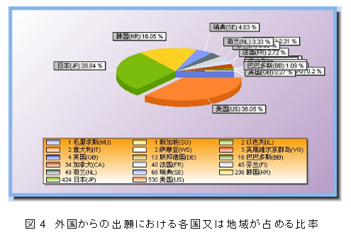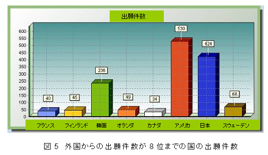 図5は外国からの出願件数が8位までの国の出願件数を示している。1位のアメリカは530件であり、次は日本の424件であり、韓国の出願件数は上位2国に比較すると少なく、236件である。