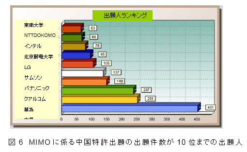 図6は、MIMOに係る中国特許出願の出願件数が10位までの出願人を示している。中興通訊(ZTE、以下、中興という)が451件で1位を占めており、その出願件数は第2位の華為技術有限公司(Huawei Technologies、以下、華為という)より80%も多い。第3位はアメリカのクアルコム(QUALCOMM)であり、その出願件数は華為とほぼ同じである。第4位のパナソニック以降の出願件数は明らかに減少していく。10位までの出願人のうち、4社は中国企業であり、アメリカ、日本及び韓国はそれぞれ2社である。