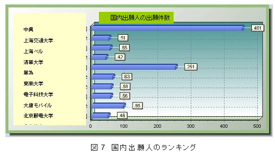 図7は国内出願人のランキングを示している。中興、華為、大唐モバイル通信設備有限会社(Datang Mobile Communications Equipment Co., Ltd、以下、大唐モバイルという)の3社以外に上海ベル、北京サムソンという外国企業の中国支社があり、他の5つの出願人は大学である。