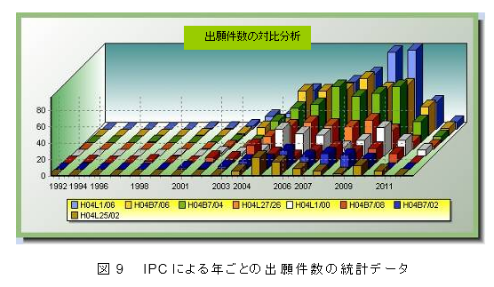 図9は、IPCによる年ごとの出願件数の統計データであり、出願件数が8位までのIPC分類番号が記載されている。まず、これらの分類番号の意味を紹介する。