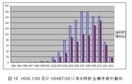 H04L1/00及びH04B7/00に係る特許出願件数の動向をより明確に示すために、他の分類が付与されておらず、これだけが付与された毎年の出願件数を図10にまとめた。図10からみれば、H04B7/00の出願件数は2002年~2008年の間に急速に増加し、件数からすれば、明らかにH04L1/00より多い。これは、その間では、物理層に係る出願はデータリンク層に係る出願より遥かに多いことを示している。しかし、2008年以降、H04B7/00の出願件数はしだいに減っていくのに対し、H04L1/00の出願件数は大幅に増加し、2010年の出願件数はH04B7/00とほぼ同じになる。これは、近年、物理層に関する研究が若干少なくなってきたのに対し、データリンク層に関する研究が増加し続けていることを示している。