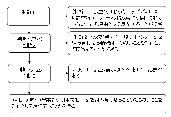 上述した規定を一言で言えば、請求項の発明が同一の引用文献における複数の発明の組み合わせまたは複数の引用文献の組み合わせに対して進歩性を有しないことが成立する要件は、a. 同一の引用文献における複数の発明の組み合わせまたは複数の引用文献の組み合わせに請求項のすべての構成要件が開示されていること、b.最も近い公知技術(つまり引用文献1)との相違点に係る構成が、当該構成を開示した引用文献1の他の技術または他の引用文献において果たした役割は、当該構成の本願発明における役割と同一であること、という2つである。