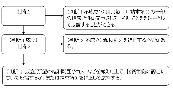 判断1:審査官の技術認定が正しいかどうか、すなわち、引用文献1、2に請求項Xのすべての構成要件が確かに開示されているかどうかを判断する。