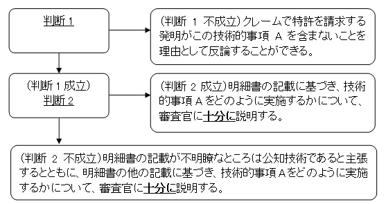 また、判断2が成立しない場合、実施可能要件違反を解消するために、明細書の説明が不明瞭なところについて、それは公知技術であると説明するしかない。しかし、このように対応する場合、以降の審査においてその技術的事項が公知技術として扱われるため、それを理由として発明の新規性や進歩性を主張することはできなくなる。