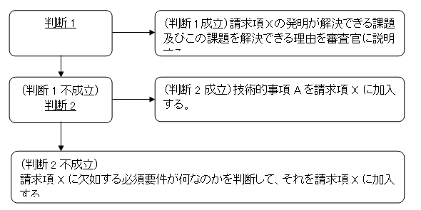 判断2:技術的事項Aが、請求項Xに欠如する必須要件であるか否かを判断する。