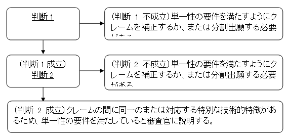 <留意点> 審査官がクレーム1及びその従属クレームについて先行技術の調査及び審査をすでに行った場合、応答時に、調査・評価されたクレーム1を削除し、クレーム1と単一性違反の未調査のクレームX及びその従属クレームを残すことはできない。このような補正は特許法実施細則第51条第3項に規定する要件を満たさないと判断されるため、このように補正する場合、審査官は補正前の書面に基づいて、特許法第31条第1項に違反することを理由として出願を拒絶査定することができる。