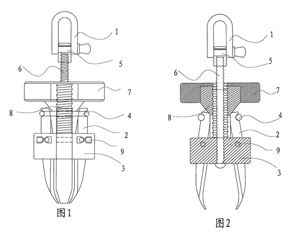 図1のように、本件実用新案に係るボタンクランプは、一定の力を加えるボタンクランプホルダ1と、開口部が薄くかつ硬い材質で作られ、物を抓み易い3つのジョー2とジョー固定ホルダ3とを備え、3つのジョー2はゴムリング4と位置決めピン9によりジョー固定ホルダ3に接続され、ジョー固定ホルダ3は固定ネジ6とナット5によりボタンクランプホルダ1に固着され、ジョー固定ホルダ3に上下に移動するように調整するための調整装置が設けられ、前記調整装置は、上下調整取っ手7と快速上下移動ネジ8とを備え、前記快速上下移動ネジ8が、前記固定ネジ6の外側に外嵌され、その一端がジョー固定ホルダ3に固着され、他端が上下調整取っ手7に螺合され、そして、上下調整取っ手7のネジピッチを快速上下移動ネジ8より細くして、上下調整取っ手7をやや回転させるだけで、長い距離を移動するように快速上下移動ネジ8を駆動することができる。本実施例では、図2のように、快速上下移動ネジ8の外形が楔形となっているので、3つのジョー2の頂部をゴムリング4を介して快速上下移動ネジ8の外側に位置させるとき、上下移動ネジ8の外側の楔形構造及び上下移動により開閉動作を行うことができ、また開閉動作の範囲はジョー固定ホルダ3により制限されている。