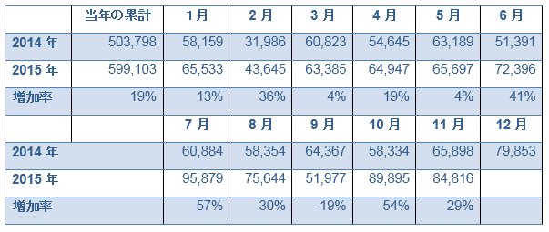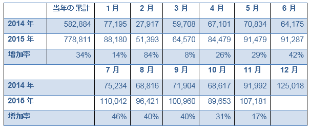 表1からも分かるように、前年同期比の増加率が最も大きいのは2月の84%で、最も小さいのは3月の8%で、7月、9月と11月の受理件数は10万件を超えた。
