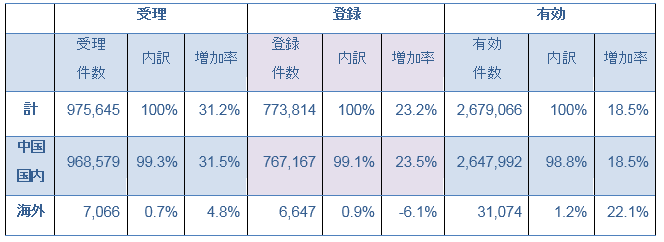 また、特許の種類別では、発明特許、実用新案及び意匠の出願件数はそれぞれ、93万1247件、97万5645件、49万3002件で、前年同期比でそれぞれ19%、31%、1%増加した。