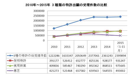 中国『国家知識産権局特許業務及び総合管理統計月報』のデータ(http://www.sipo.gov.cn/tjxx/tjyb/)によると、2015年1月から11月までの中国の3種類の特許(発明特許、実用新案、意匠)出願の総受理件数は239万9894件で、前年同期の201万5267件より19%増加した。そのうち、中国国内からの出願件数は前年同期比20%増の225万5829件で、海外からの出願件数は前年同期比6%増の14万4065件であった。
