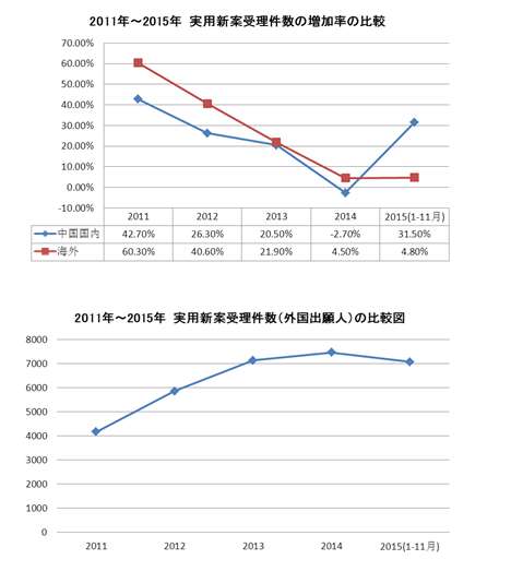 また、下記の表から分かるように、2011年から2014年まで、実用新案出願の受理件数の増加率は年々減少したが、2015年は大きく増加した。外国出願人の出願件数の増加率の変動は、国内出願人の出願件数の増加率の変動より小さくなっている。国内出願人による出願件数は2014年に前年比で2.7%減少したが、外国出願人による出願件数は前年比で4.5%増加した。そのほか、国内実用新案の出願件数が膨大であるため、実用新案の増加率は国内増加率とほぼ一致している。