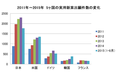 2011年から2015年までの外国からの実用新案出願件数では、日本、米国、ドイツ、韓国及びフランスが上位5ヶ国となっている。