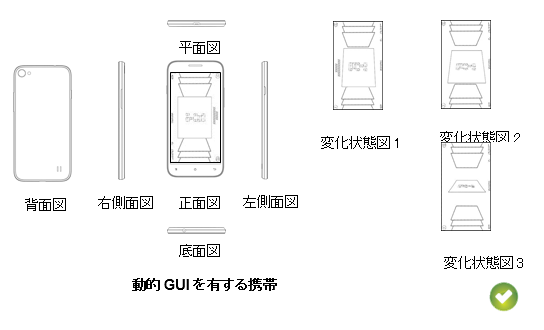 ⑤動的なGUIをもつ製品の意匠出願の場合、出願人は、少なくとも1図、GUIを含む製品全体の意匠図面を提出しなければならない。ほかの変化状態について、重要な図面だけを提出すればよいが、それによって動的図案の動画の変化傾向を特定できなければならない。動的図面は拡大図でも良いが、同一の比率で拡大しなければならない。