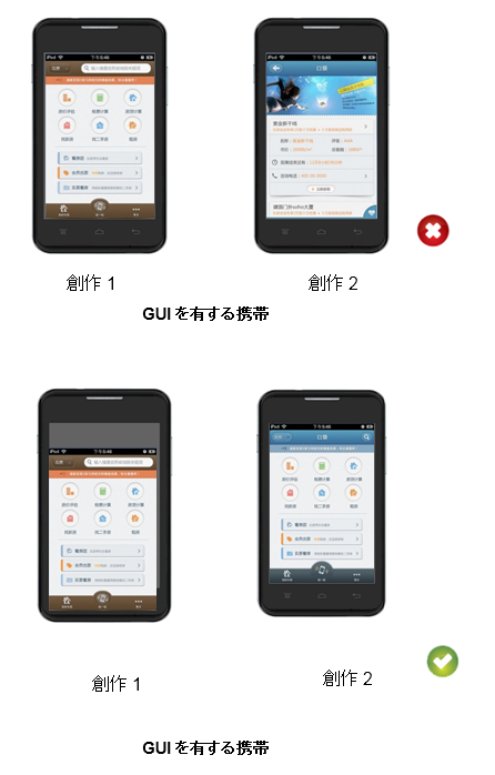 ⑦使用時に、「内容画面」をもつGUIの場合、「内容画面」の図面は、「使用状態参考図」として提出することができる。ただし、削除する際、「内容画面」を削除して良いだけで、GUIの要素を削除してはならない。「内容画面」を削除することは、単なるレイアウトのデザインを保護することとは違う。