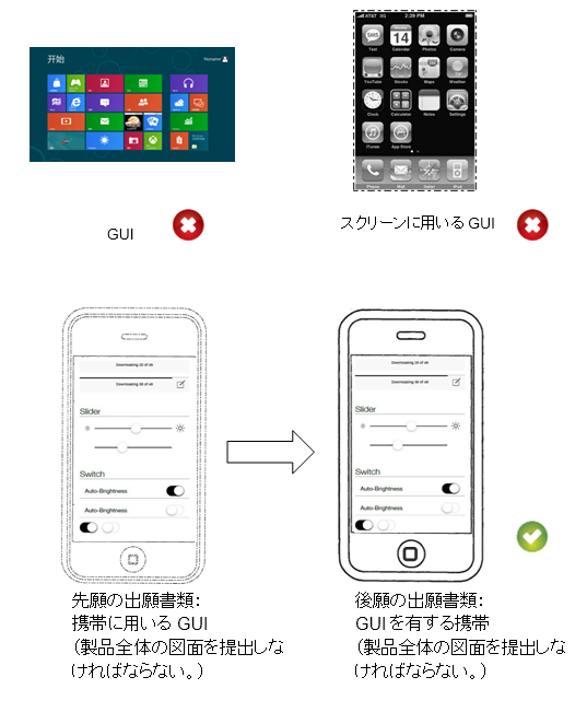 GUIを有する製品の意匠出願の場合、簡単な説明において、GUIの用途、製品におけるGUIの位置、インタラクションの方法及び変化状態などを明記したほうがよい。