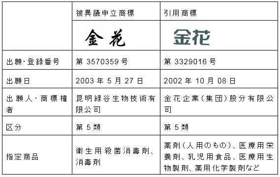 被異議申立商標と第3329016号商標「金花」とは、『商標法』第28条に定めた同一又は類似の商品における類似商標に該当するものではない。被異議申立商標「金花」は、金花社の企業名称の主要な識別部分である「金花」と文字構成については、同一であるが、非類似の商品において使用され、関連公衆に混同や誤認を生じさせるおそれがないため、金花社の知名な先行企業名称権(商号権)への侵害に当たらない。