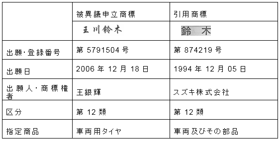 被異議申立商標と引用商標は、いずれも文字商標である。被異議申立商標は漢字「王川鈴木」から、引用商標は漢字「鈴木」から構成されている。被異議申立商標は引用商標の漢字を完全に含んでおり、かつ引用商標と明らかに識別できる他の意味を形成していないため、両商標は類似商標に該当する。被異議申立商標の指定商品である「車両用タイヤ」と引用商標の指定商品である「車両及びその部品」とは、機能、用途、流通ルートなどの面において密接な関連性を有し、類似商品に該当する。被異議申立商標と引用商標とは、上述の類似商品において共存した場合、商品の出所について消費者の混同や誤認を容易に生じさせるため、『商標法』第28条に定めた類似商品における類似商標に該当する。