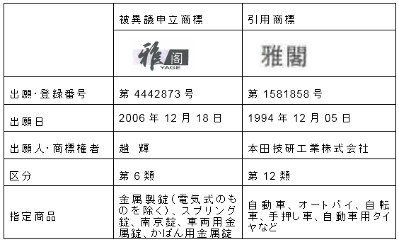 被異議申立商標と本田社が引用した先行登録の商標「雅閣」などとは、指定商品が類似していない。本事件において本田社が提出した証拠は、その引用商標が馳名商標であることを証明するのには十分でない。また、趙輝がその引用商標を複製したという本田社の主張は、証拠が不十分である。そのため、異議申立人の異議申立理由は成立せず、被異議申立商標の登録を許可する。