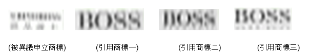 被異議申立商標と引用商標三、四と比べると、引用商標三、四は「BOSS+HUGOBOSS」からなる。その要部は「BOSS」であるが、「HUGOBOSS」の部分ははっきりと識別できる。被異議申立商標は「「班尼波士」を含めている。引用商標はそれを含めていないが、いずれも意味のある「BOSS」を有する。商標のその他の要素は共に格別な意味を有しない。商標「BOSS」の著名度を考慮したうえ、被異議申立商標は「BOSS」の存在によって、消費者に当該部分に対して「班尼波士」より多くの注意を払わせやすい。HUGO BOSS AGの引用商標と関連があると誤認を生じさせやすい。両商標は第25類の商品において使用された場合、消費者に両社の商品の出所について誤認を生じさせやすい。