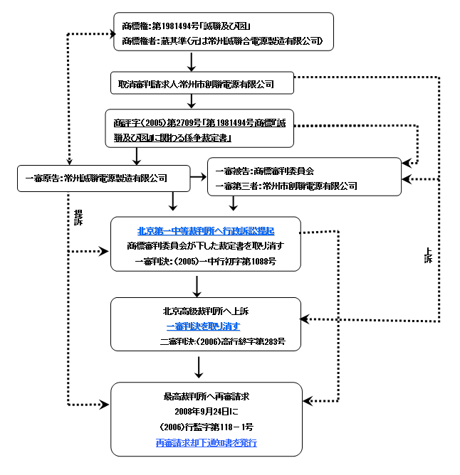 誠聨公司は、2001年9月29日に国家工商行政管理総局商標局に第9類「電気スイッチ」を指定商品として商標「誠聨及び図」(以下係争商標という)を出願し、2003年2月14日に登録された。その登録番号は1981494で、存続期間は2003年2月14日から2013年2月13日までである。