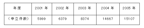 調査によると、2001年から2005年まで中国の商標異議申立の件数は年々増加してきました。具体的なデーターは下表をご参考願います。中国の商標異議申立案件は、商標局の異議裁定一処と異議裁定二処の審査官たちにより審査されています(注:「処」は中国商標局の一部門のことをいう)。現在、異議処には審査官とその他のスタッフが約20名います。去年、審決の異議申立案件数は8000件ぐらいありました。現在は、2003年末~2004年始めに提出された異議申立案件が審査されているそうです。このように、1件の異議申立案件の審査は約3~4年間かかっています。