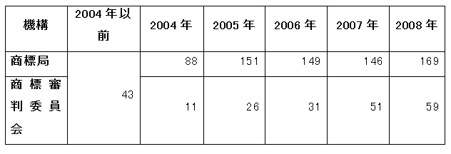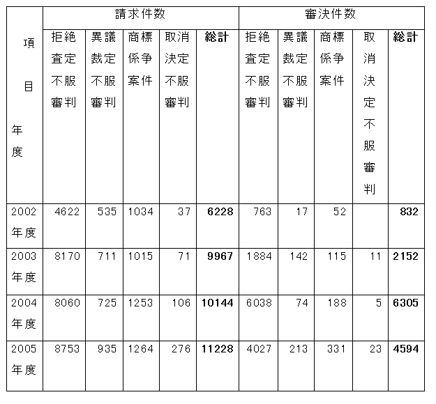 2002年から2005年までの商標審判案件の請求件数と審決件数の統計データは下表の通りです。審判案件を審理する機関は商標局ではなく、商標審判委員会です。商標審判委員会は商標局と同格の商標行政審理機構であり、商標係争案件、拒絶査定不服審判、異議裁定不服審判と取消決定不服審判を受理します。当事者は商標審判委員会の決定や裁定に不服がある場合、北京市第一中級裁判所に行政訴訟を提出することが可能です。現在、商標審判委員会には70数人の人員がおり、2001年~2002年請求された当事者双方に関する各種の案件及び2004年以後請求された商標拒絶査定不服審判案件を審理しているところです。