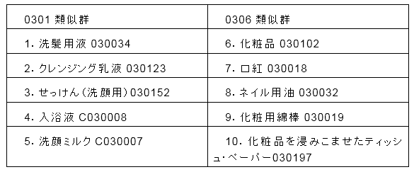 それから、『区分表』の関連説明によれば、出願人は、商標登録出願において、具体的な商品又は役務を記入しなければならないが、区分の見出し又は類似群の見出しをそのまま記入することはできない。したがって、第3類の見出し「洗濯用漂白剤及びそのほかの洗浄用商品;洗浄、艶出し、擦り磨き及び研磨用製剤;せっけん;香料;芳香油;化粧品;洗髪用液;歯磨き」並びに0301類似群の見出し「せっけん、化粧せっけん、そのほかの人用洗浄用品、洗濯用漂白剤及びその他の洗浄用商品」及び0306類似群の見出し「化粧品(動物用化粧品を除く)」は、通常そのまま指定商品として出願することができないので、類似群の下に固有番号を付けた具体的な商品項目を選ぶことが必要である。