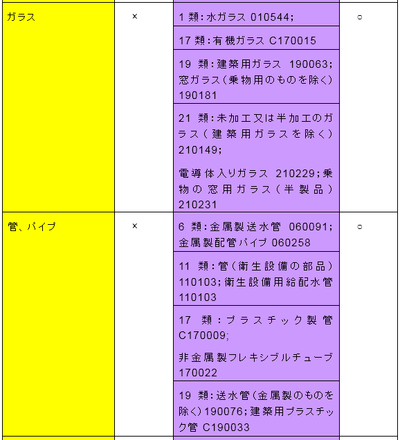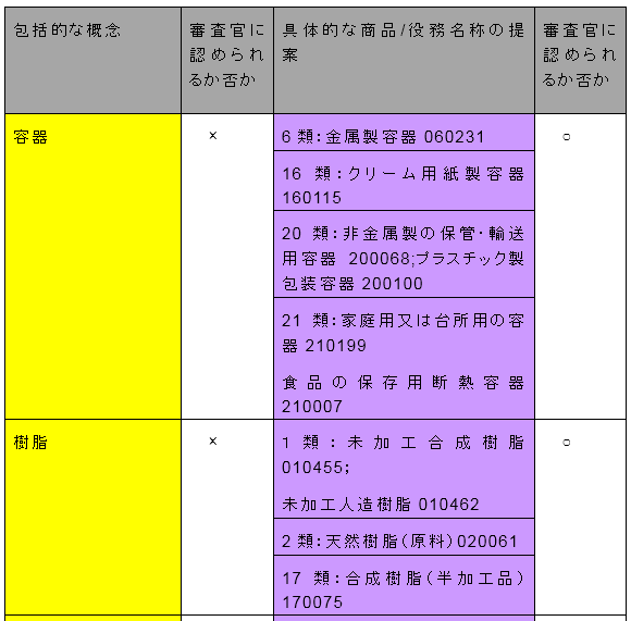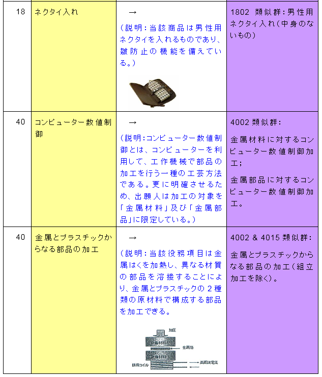 また、「ネクタイ入れ」は第18類において結局受け入れられなかったが、審査官と相談した結果、『区分表』に第18類の1802類似群コードが付された例示商品である「携帯用化粧道具入れ(中身のないもの)180093」を模倣して、その表現を「男性用ネクタイ入れ(中身のないもの)」に調整したことにより、最終的に受け入れられた。