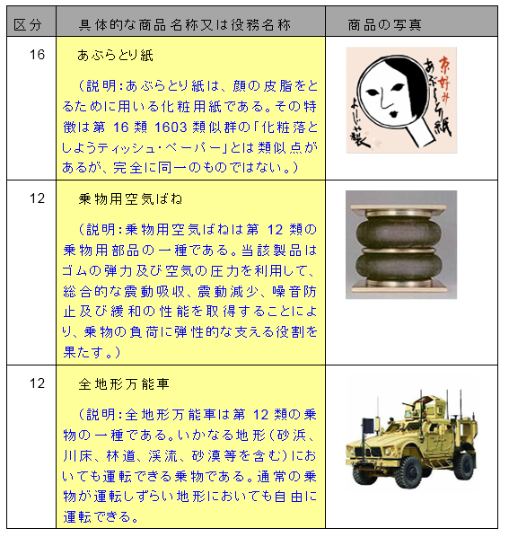 『区分表』に記載された具体的な商品名称は日常的な生産や生活の中から生まれた商品名称なので、両者が限定する概念と範囲はほぼ同じである。例えば、洗髪用液、せっけん(洗顔用)、洗顔用ミルク、口紅などが挙げられる。但し、『区分表』に記載された具体的な商品名称の中で、一部上位概念の商品名称もある。例えば、化粧品は、類似群の区分からすると、髪や体の清潔用洗髪用液、せっけん(洗顔用)、洗顔用ミルクなどの商品を含まないのは明らかなことである。これは化粧品の一般的な概念と異なっているので、出願の際、留意していただきたい。