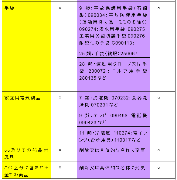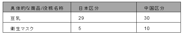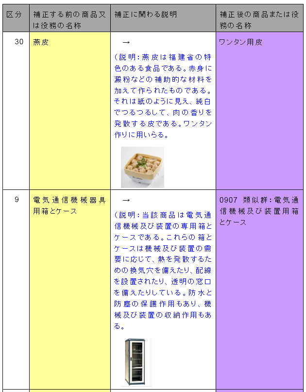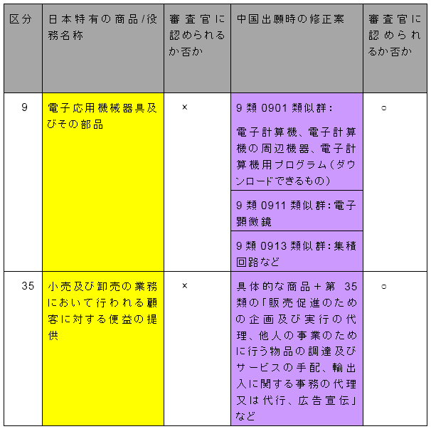 また、一部の商品は、日本特有な商品/役務であるため、中国で出願する際、適当な調整をする必要がある。例えば、「電子応用機械器具及びその部品」は日本で特定の範囲内で限定されているが、中国語に直訳したら、その意味が明確でないので、中国で出願時には補正指令を受ける可能性が高い。もし運良く登録されたとしても、その意味の不明確さにより、権利行使の段階で、うまく行使できないおそれがある。したがって、中国で出願する時、下表の修正案を参照しながら、具体的且つ明確な商品を指定することで、出願することを提案する。