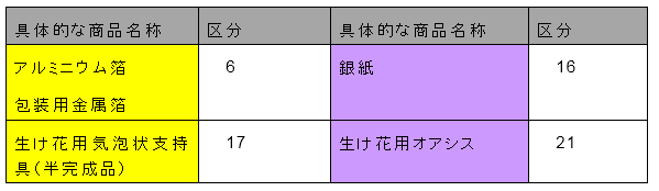 例えば、「食品包装用アルミニウム箔」も「銀紙」と呼ばれることがある。検索を通じて、この二つの名称が実際には同一のものを指しているし、機能や用途も大体同じである。但し、『区分表』によって、両者は上表の通り、異なる区分に属し、且つ類似商品にも該当しない。