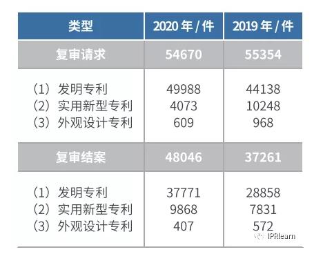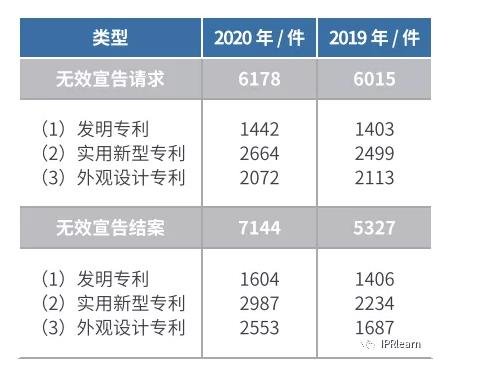 2020年、特許の無効審判請求の受理件数は6178件(同2.7%増)で、結審件数は7144件(同34.1%増)で、平均結審期間は5.9ヶ月であった。結審した発明特許の無効審判案件のうち、全部無効、一部無効、有効維持(有効維持、無効審判請求の却下、みなし取り下げ、無効審判請求人による自発的な取消案件も含む)の案件の割合それぞれは25.3%、14.9%、59.8%であった。結審した実用新案の無効審判案件のうち、全部無効、一部無効、有効維持の案件の割合それぞれは39.2%、18.2%、42.6%であった。結審した意匠の無効審判案件のうち、全部無効、一部無効、有効維持の案件の割合それぞれは46.0%、1.1%、52.9%であった
