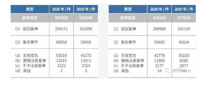 2020年、受理した各種類の商標審判請求件数は36.7万件(同1.7%増)となり、うち拒絶査定不服審判の受理件数は29.8万件(同1.3%減)で、当事者双方に係る複雑な案件の受理件数は6.9万件(同16.9%増)であった。各種類の審判案件の裁定件数は35.8万件(同6.3%増)で、うち裁定した拒絶査定不服審判案件は30.0万件(同3.0%増)で、当事者双方に係る複雑な案件は5.8万件(同27.5%増)であった。