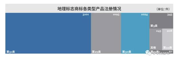 登録済の地理的表示商標のうち、第31類の農産物、新鮮な果物と野菜など商品に使用されたのは最も多く、計3101件あり、全体の51.0%を占めており、続いては、第29類(肉、魚、卵、乳などの商品)と第30類(コーヒー、お茶、米、蜂蜜などの商品)に使用されたのはそれぞれ18.0%と16.8%を占めた。これにより、地理的表示が主に農産物及び初級加工品、漢方薬とお茶などに使用されており、農業と最も密接に関わっていることが示された。