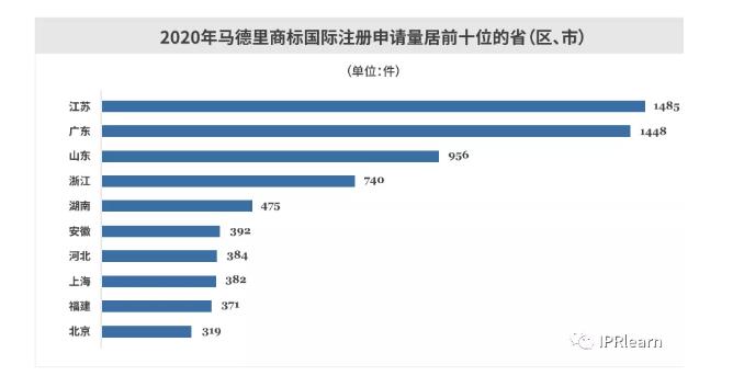 2020年、中国国内出願人によるマドリード・プロトコルの商標国際登録出願は、区分別で統計すれば、上位3の区分それぞれは第9類(科学機器、コンピュータ、デジタル記憶媒体など)、第7類(機械、工作機械、モーターなど)と第35類(広告、商業経営、商業管理、勤務事務など)であった。指定された締約国で統計すれば、上位3の国はロシア、米国、ベトナムであった。