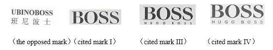 Whether the No. 1676649 trademark “UBINOBOSS 班尼波士” is similar to the cited mark I No.257001, cited mark III No.G550975 and cited mark IV No.G606620 on identical or similar goods.
