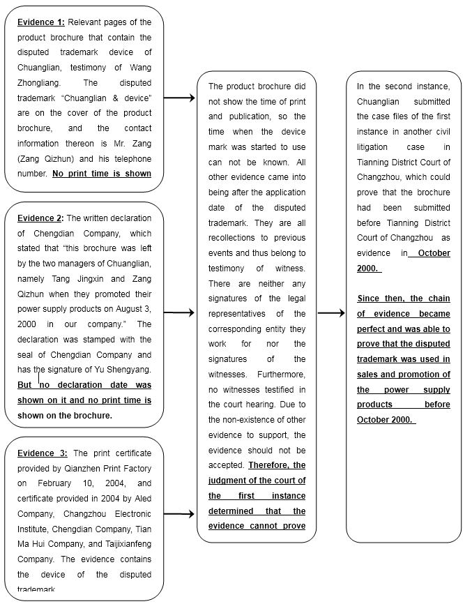 As mentioned above, to prove Chuanglian’s prior use of the disputed trademark, Chuanglian provided a lot of evidence in the trademark dispute adjudication procedure. Among them, the brochure is very important evidence. Although it showed the device of the disputed trademark, it did not show the time of print and publication. Therefore, the evidence cannot show when the device was firstly used. Since the testimony of Chengdian Company, print certificate of Qianzhen Print Factory and evidence provided in 2004 by Aled Company, Changzhou Electronic Institute, Chengdian Company, Tian Ma Hui Company, and Taijixianxing Company submitted by Chuanglian all belong to testimony of witness which were not supported by other evidence. Therefore, they were not accepted or supported by the court of the first instance.